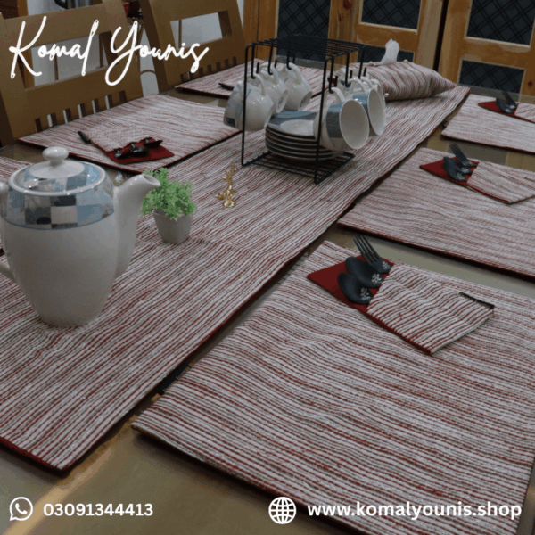 Stylish crimson striped dining table set with mats, runner & tissue box — perfect for 6 seater dining spaces.