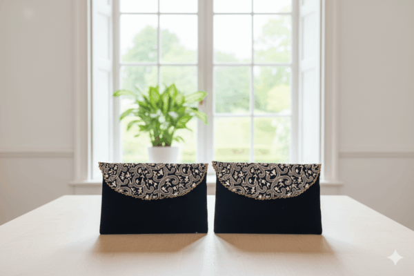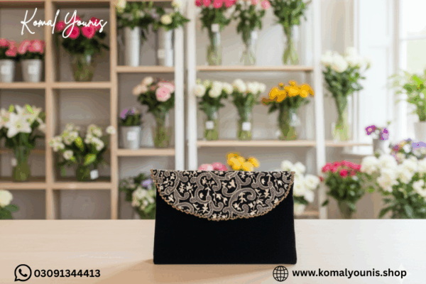 This black velvet clutch bag is crafted for women who love classic elegance. The premium velvet finish with a beautifully embroidered flap makes it a stunning accessory for every celebration. Perfect as a velvet clutch bag for wedding events, formal dinners, or festive gatherings, it brings a touch of luxury to both western and traditional outfits.