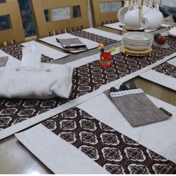 Each piece features a soft yet durable tablecloth dining table cover texture that ensures easy cleaning and everyday use. The table mat dining table cover and matching runner complete the look, while the elegant tissue box cover adds a coordinated finish to your dining setup.